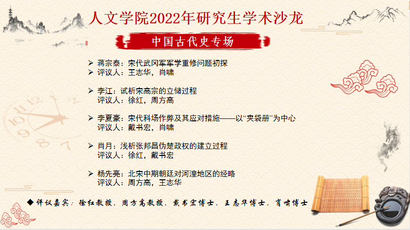 9月25日下午2点半,公司于立言楼B106室举行了“学而思”研究生学术沙龙中国史专业古代史方向专场。沙龙评议嘉宾有徐红教授、周方高教授、戴书宏博士、王志华博士、肖啸博士,学术报告人有蒋宗泰、李江、李夏豪、杨先亮四位来自中国史专业中国古代史方向的研究生,22级中国古代史方向的研究生参与旁听。