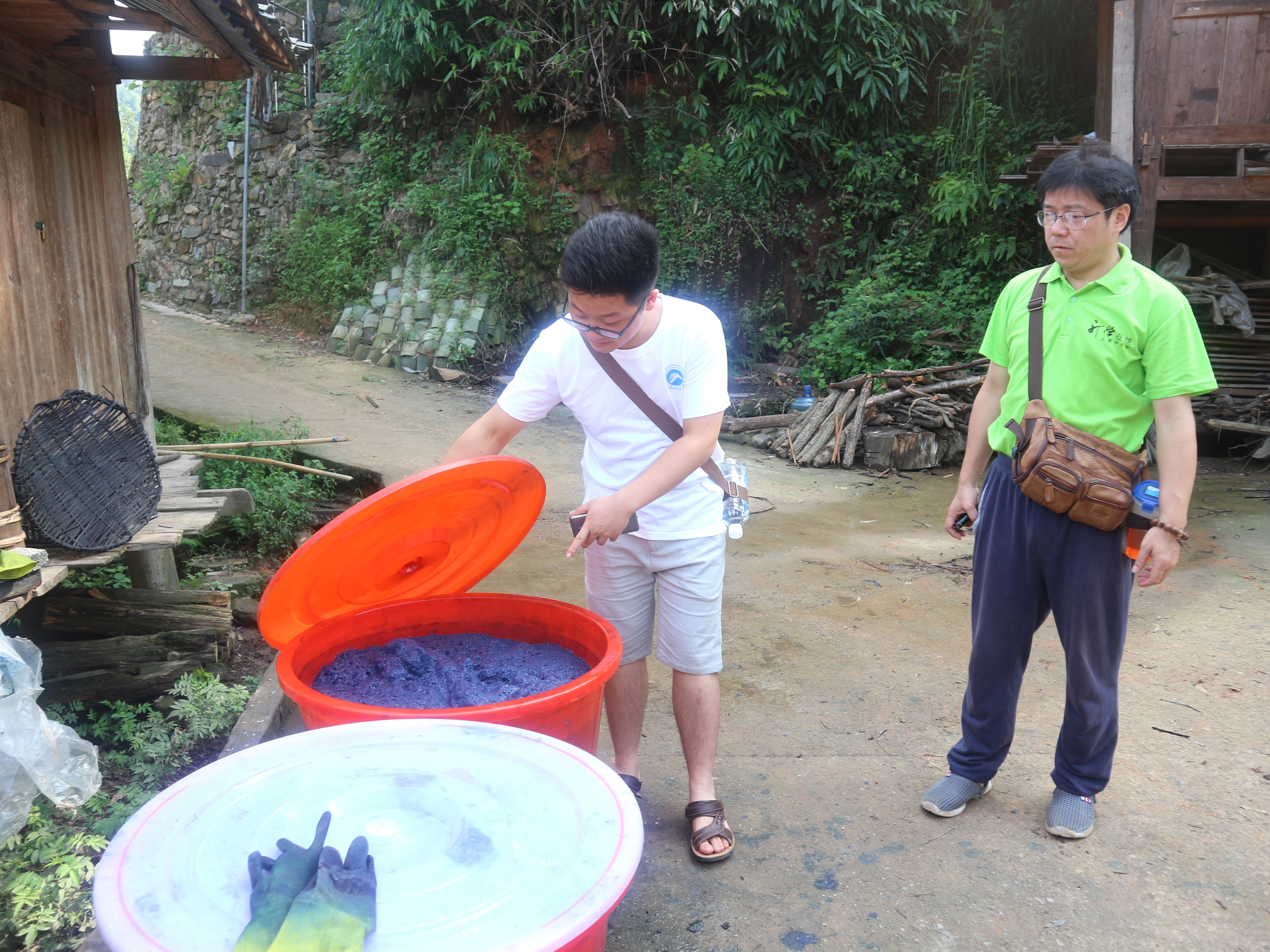 (图为球盟会研究生暑期科技服务团成员在仔细观察靛蓝染缸)