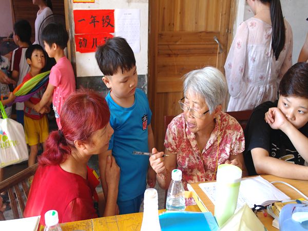 “黑黑的天空低垂,亮亮的繁星相随,虫儿飞,虫儿飞,你在思念谁……”在志愿者曹紫瑶的引导下,孩子们整齐地唱起了《虫儿飞》,小手随着节拍挥舞着,脸上泛着笑。甜美的歌声与树上的蝉鸣相随相和,和谐安然,给闷热的天气添了几分凉意。美术课上,四、五年级的孩子们照着黑板上老师的绘画,像模像样地画起了素描静物,他们左右转动着画纸,低头认真勾勒出陶罐的形状。在讲解有理数运算时,志愿者谢思用推导的方法对题目进行变式延伸,引导孩子们思考。孩子们则聚精会神,时而嘴咬笔尾,时而手捧脸颊,若有所思,在作业本上写着密密麻麻的题目和解答过程。
