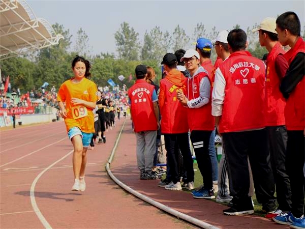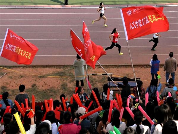 “人文,加油!春玲,挺住!”踏着节奏的点,在震耳欲聋的口号声中,球盟会的院旗齐齐应景地飘扬在观众席上空,台下正值女子3000米赛场终点处,这狂热喧天的阵势,皆为16级新闻二班的宋春玲。