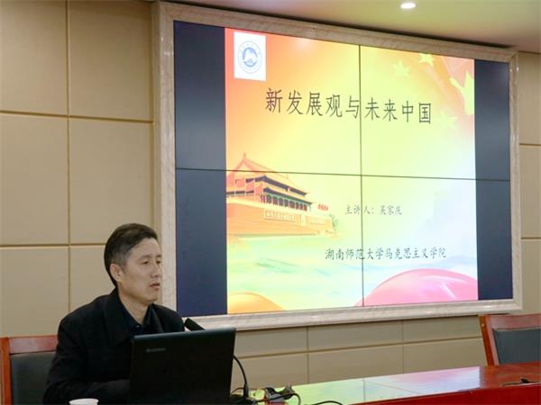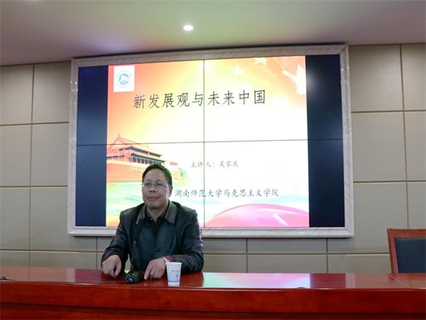 11月13日晚,立言楼B4-1会议室座无虚席。湖南师范大学马克思主义公司经理吴家庆教授应球盟会诚邀开展“人文大家讲坛”第149讲暨题为“新发展观与未来中国”的主题讲座。公司党委书记廖加林教授出席并主持讲座,副经理毛小平博士、张晚林教授、罗建文教授、颜中军博士、凌应生博士、龚超博士等老师及公司100余名思想政治教育、哲学专业同学到场聆听讲座。