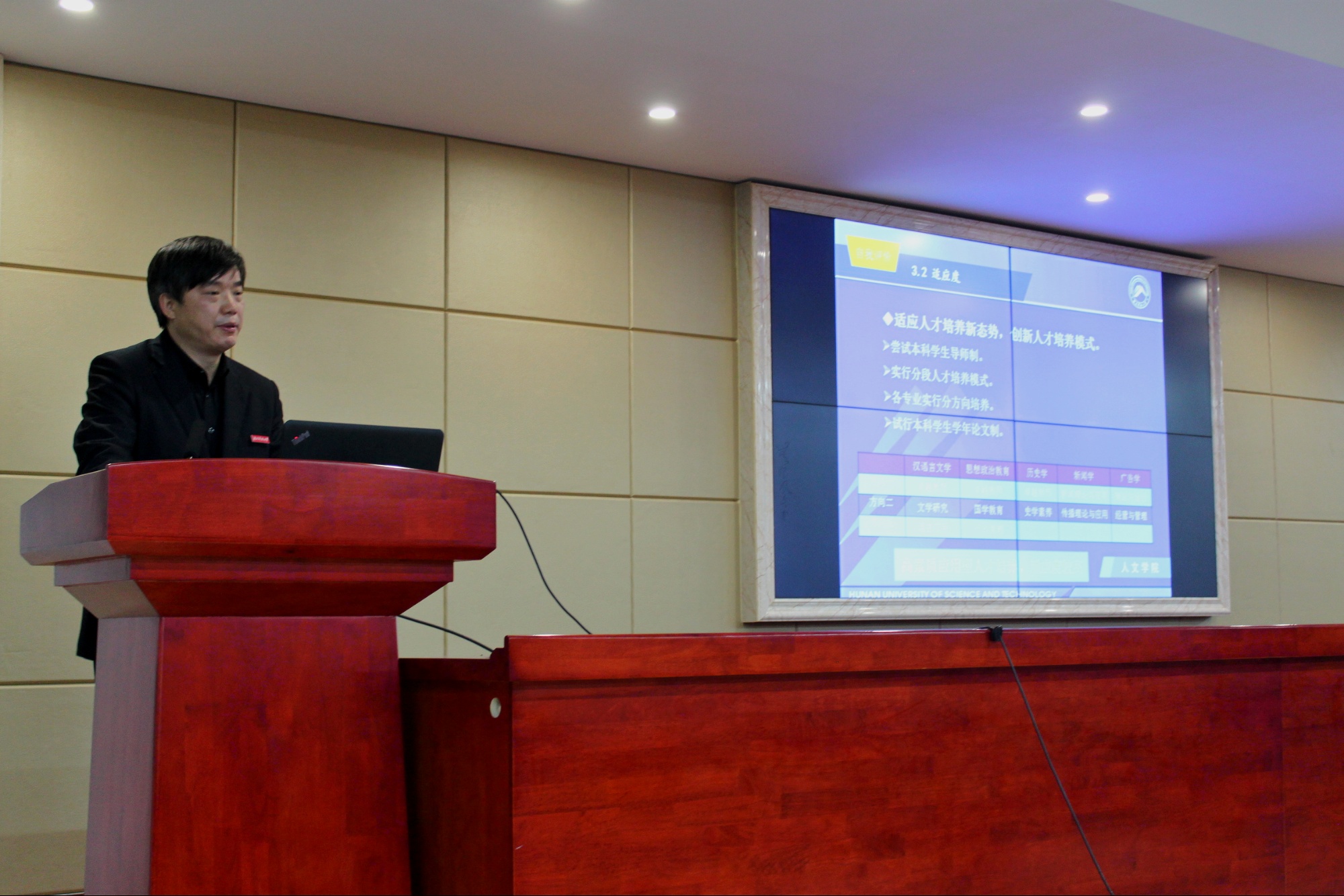 上午9时许,现场考察转移到立言楼B4-1报告厅,经理刘奇玉教授主持会议并做简要的汇报,院领导、相关系部负责人和教师代表近20人出席会议。刘经理首先简要阐述了球盟会的办学历程以及办学现状,公司的团队队伍以及定位与目标,他指出公司的办学类型是教学研究型,办学层次是本科教育为主,发展目标是特色鲜明的高水平教学研究型公司。3211工程、豆沙包工作室、黑蚂蚁传媒工作室、语言艺术团、隐山哲学社等公司优秀项目是公司坚持“守正创新”办学宗旨的重要体现。