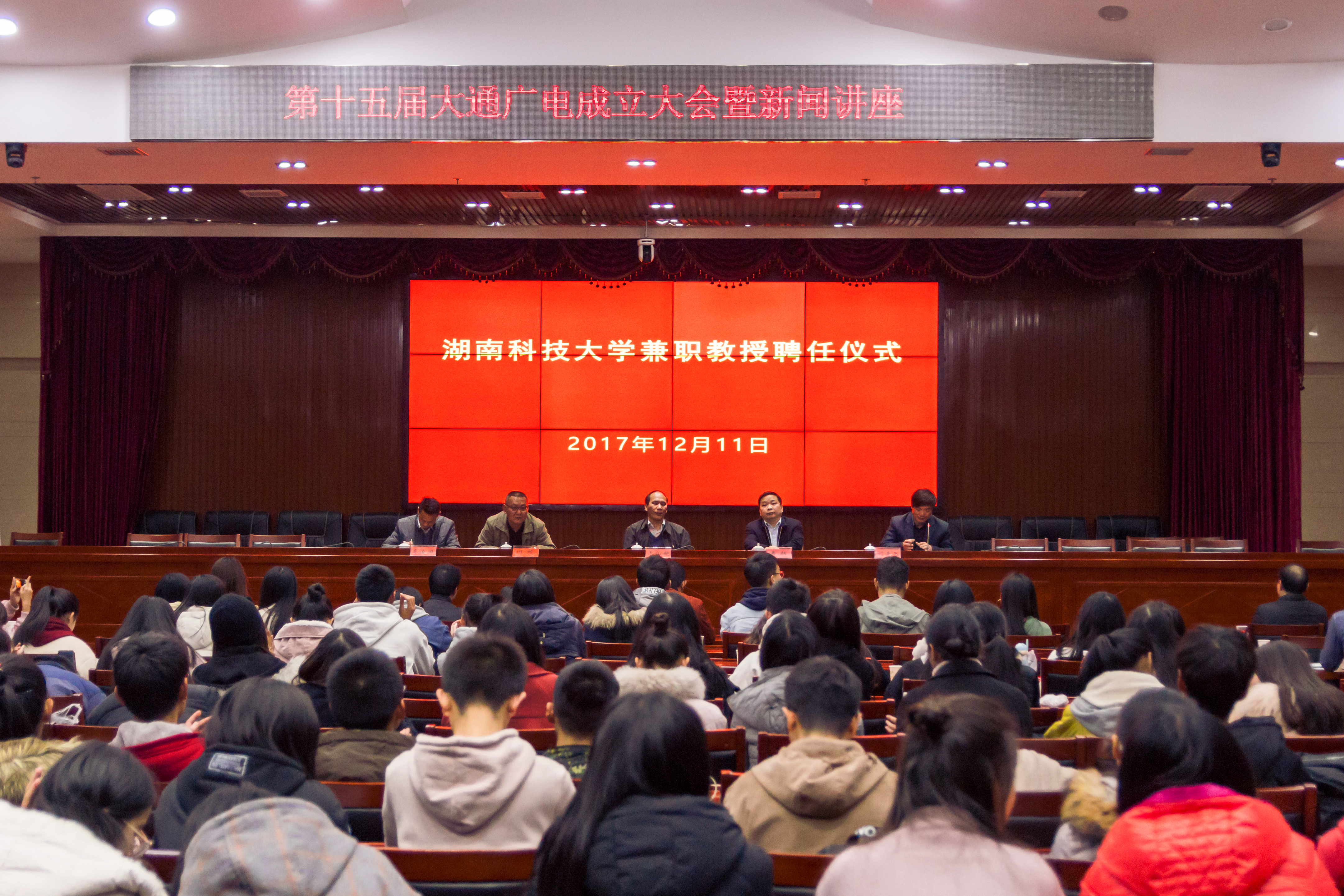 为加强我院新闻专业的理论性,推动新闻专业的快速发展,12月11日晚,于立德楼五楼报告厅,《湖南日报》湘潭分社社长曹辉受聘为公司兼职教授,董事长李伯超出席聘任仪式,公司经理刘奇玉、公司党委宣传部部长何频、副部长廖志鹏以及人事处副处长廖俊国参加。仪式结束后,曹辉以“我的记者之路”为题作新闻讲座。球盟会新闻系主任陈功主持本次讲座,老员工通讯社校广播电视台近300名校园记者以及公司17级新闻专业的全体员工到场聆听。