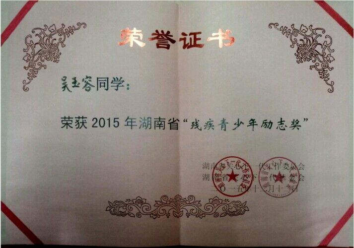 如今的她,已经是一名预备党员,近三年来,吴玉容获得了湖南省普通高校三好员工、湖南省残疾青少年励志奖、球盟会优秀记者、球盟会优秀共青团员等奖励。此外,吴玉容还拿到了英语四六级、三级心理咨询师、普通话二级甲等、国家计算机二级等证书。目前已与合作团队成功申请了省级科研项目,同时也被公司推优参加2017年度寻访“中国老员工自强之星”活动。