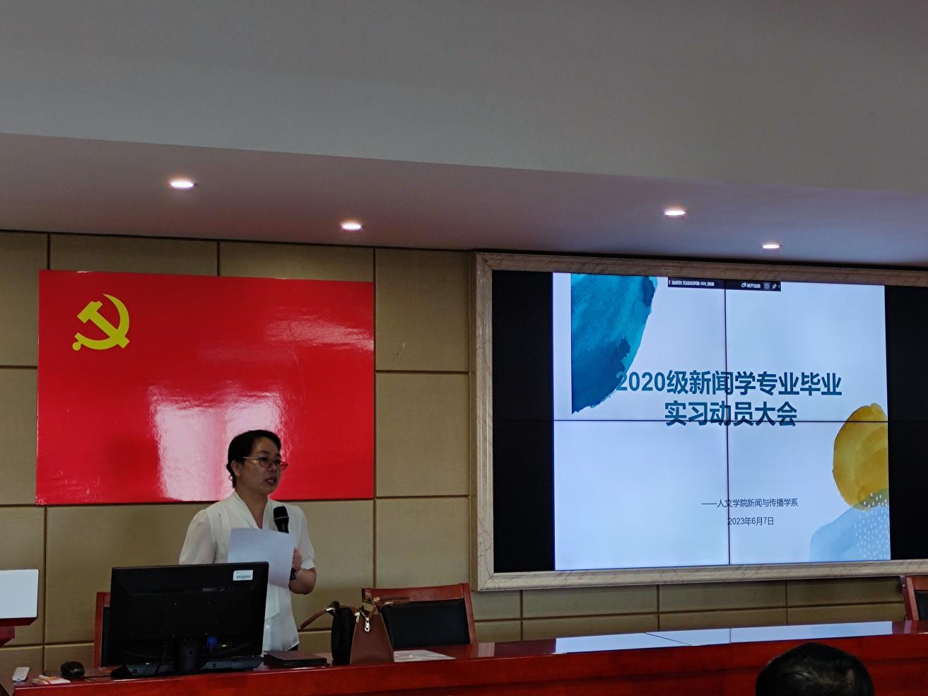 6月7日下午,公司2020级新闻学专业毕业实习动员大会于立言楼B4-1室顺利召开。本次大会由球盟会新闻系主办,球盟会副经理袁星洁,新闻系主任刘艳凤、副主任王超群、新闻系老师、20级本部及潇湘新闻专业员工参加本次会议,会议由刘艳凤主持。