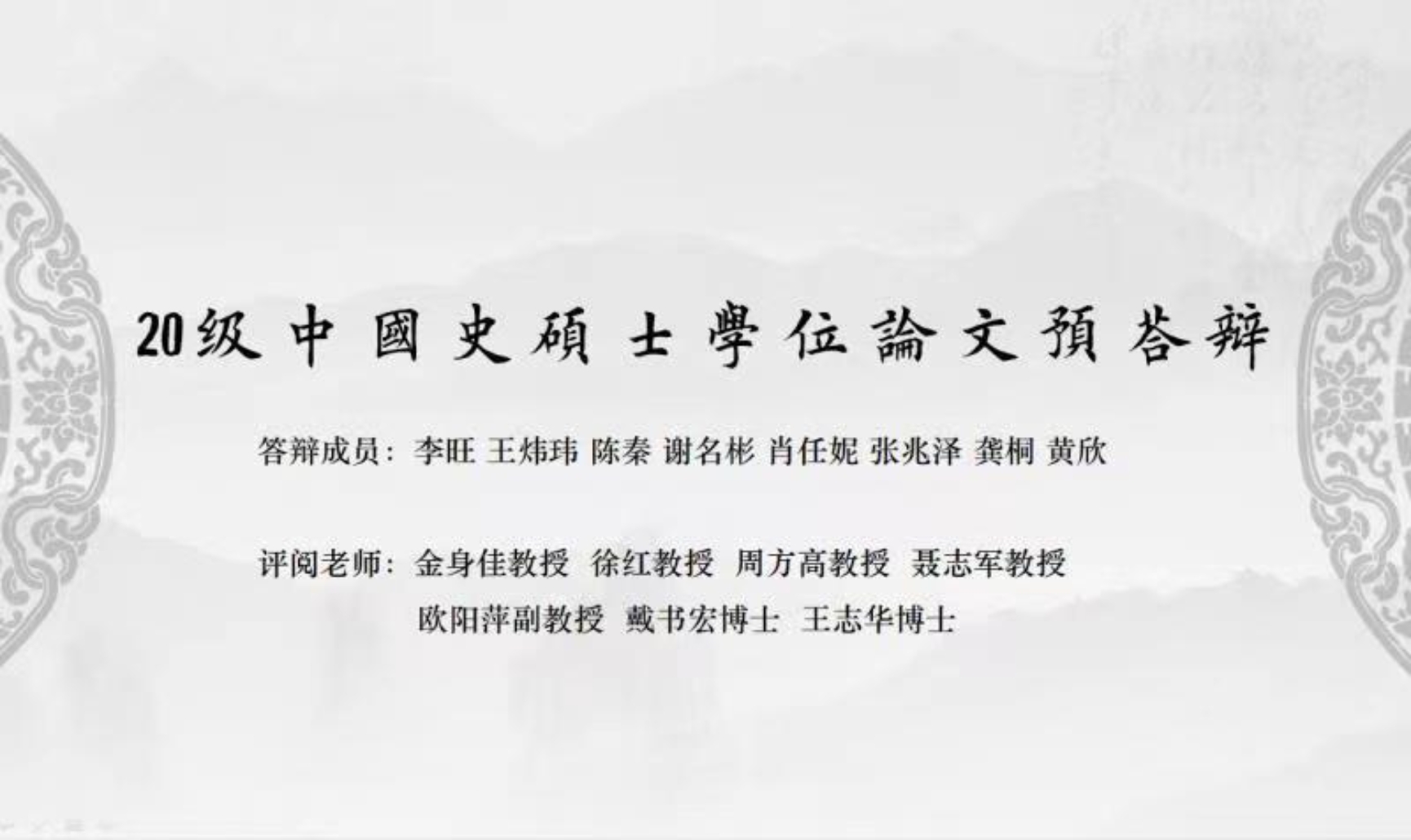 3月12日,球盟会2020级中国史1组硕士学位论文预答辩于立言楼B106如期举行。本次预答辩由徐红教授主持,金身佳教授、周方高教授、聂志军教授、欧阳萍副教授、戴书宏博士、王志华博士担任预答辩评委。