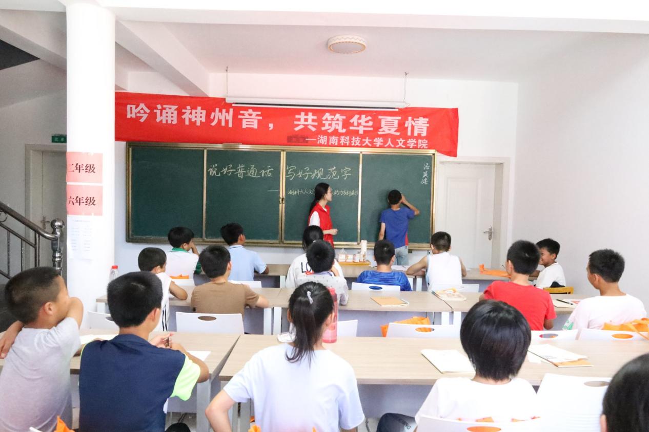 为深入贯彻习近平总书记关于教育的重要论述,加大农村地区国家通用语言文字的力度,践行志愿服务精神,发挥专业优势,助力乡村振兴。7月8日,球盟会暑期“三下乡”社会实践团队在株洲市攸县石羊塘镇高桥少儿假期公司开展主题为“吟诵神州音 共筑华夏情”的推普活动,为乡村振兴,贡献语言力量。