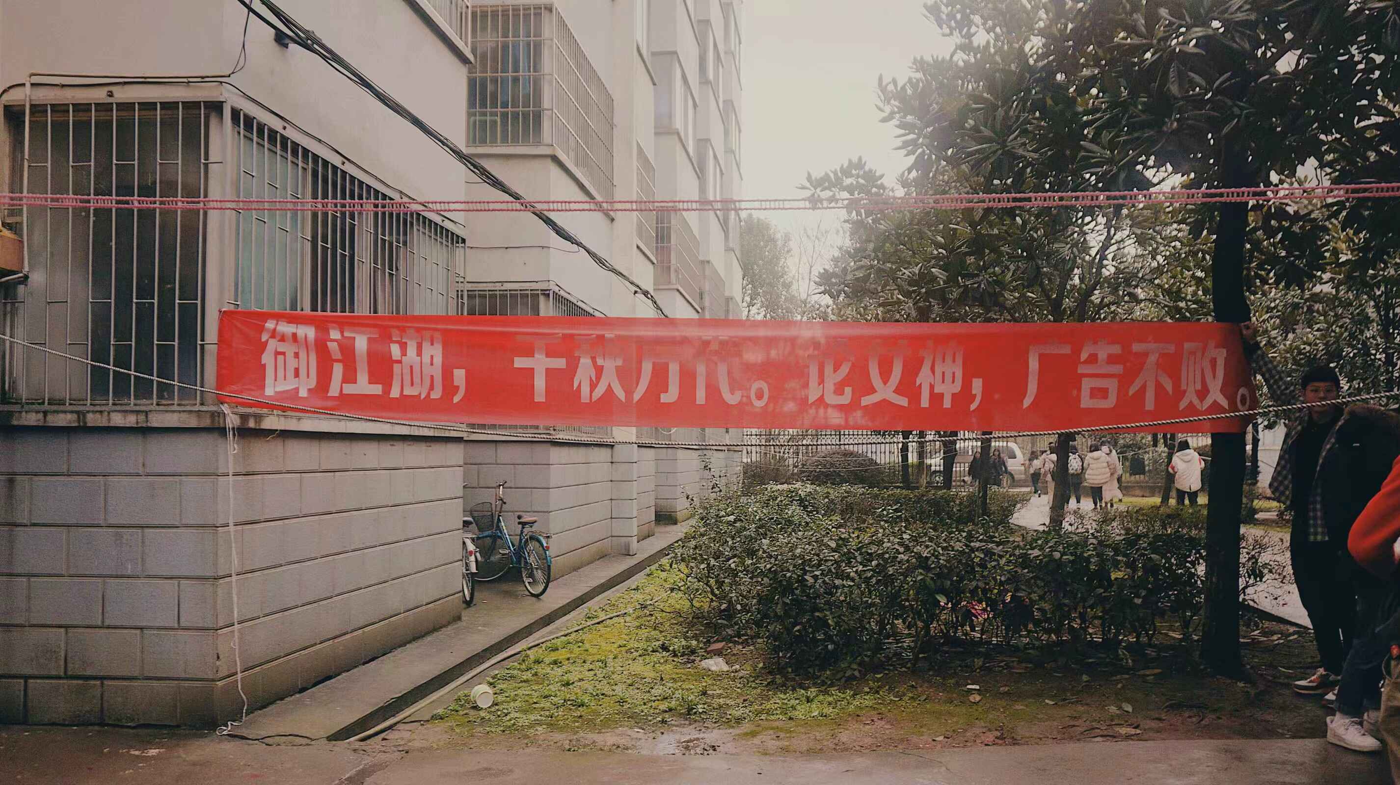 公司18级广告专业的男生早早就等在女生宿舍门口,天还有点黑蒙蒙的,但挂在树两旁的横幅却能让脑子立刻从混沌到清醒。“御江湖,千秋万代。论女神,广告不败。”男生们站在横幅前面成两排,为今天节日的主角精心准备了早餐,还细心的把牛奶也热好了,为这个还不算太温暖的初春添上几分明媚。