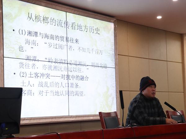 作为湘潭本地人,周大鸣教授表示槟榔是他的爱好之一。他以一张槟榔树的图片为引子,介绍了槟榔的主要产地、产量、消费市场和功用,将大家迅速带入讲座主题。周大鸣教授首先向大家展示了槟榔的研究背景:目前大多是关于的药用价值与商品价值的研究,而人文社科界对槟榔的关注则比较少。对于槟榔的食用习俗,周教授指出,在中国食槟榔的习俗可以追溯到南朝,并通过讲述东晋末年大臣刘穆之酷爱食槟榔的故事、举例苏轼诗作和竹枝词中提到槟榔的诗句等,体现出食槟榔现象在民间的普遍性。槟榔本身作为一种食品,也有着它所承载的文化涵义,如槟榔树因结果较多而有多子多福的寓意,因而在湘潭成为婚宴的必备品等。周教授说道,随着居民消费水平和槟榔在礼仪交往中实用度的提高,促使商业资本大量注入并推动槟榔消费与价格的变动,进而引发消费阶层与社会的分化,这也是槟榔的一种成长过程。