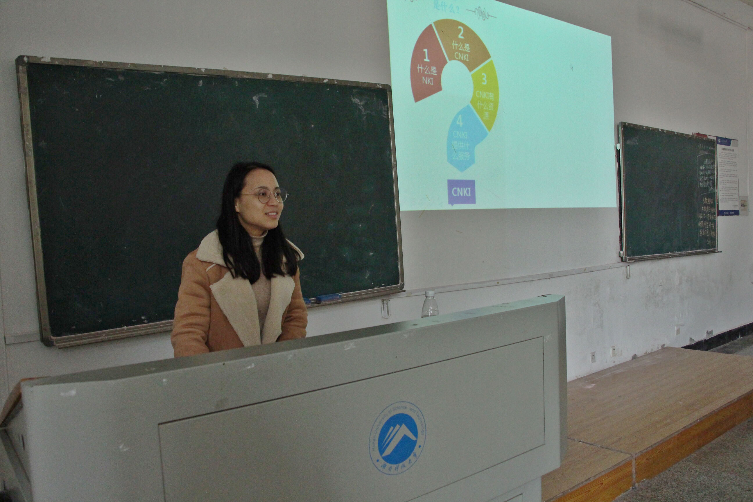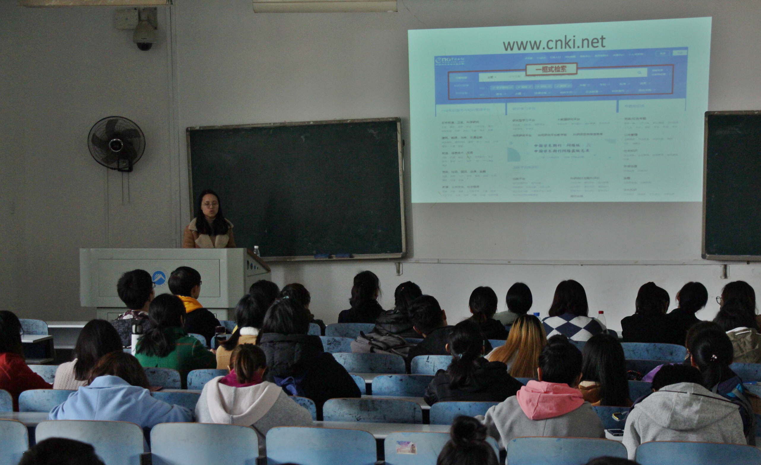 讲座开始前,校图书馆谭燕萍老师在教室大屏幕上展示了科大图书馆服务号的二维码,引导同学们进行了注册与登录。并告诉同学们,在公众号上能够阅览期刊、图书、报纸等,同时可以通过资源查找于知网对接。
