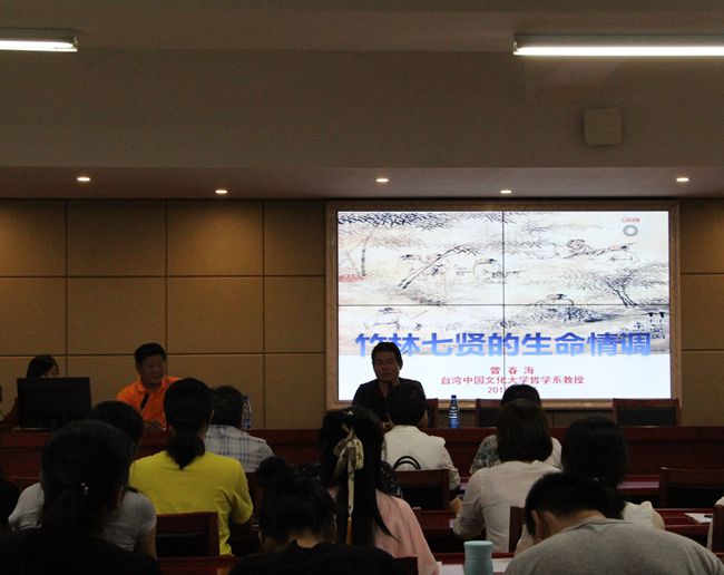 讲座伊始,曾春海教授向大家详细地介绍了竹林七贤的历史遭遇,以便大家对竹林七贤有着进一步的了解,“两汉魏晋的儒家伦理由孟子的‘由仁义行’转化至荀、韩的‘行仁义’,而司马氏的独裁,知识分子失去思想行为的自由,他们寻求如何开脱,因而走向了庄子旷达之风。”同时,他解释了“竹林七贤”一名的来历以及两次的“竹林之游”,东晋的戴逵有《竹林七贤论》一书,影响很大,“竹林七贤”一词也随之广泛地流传。